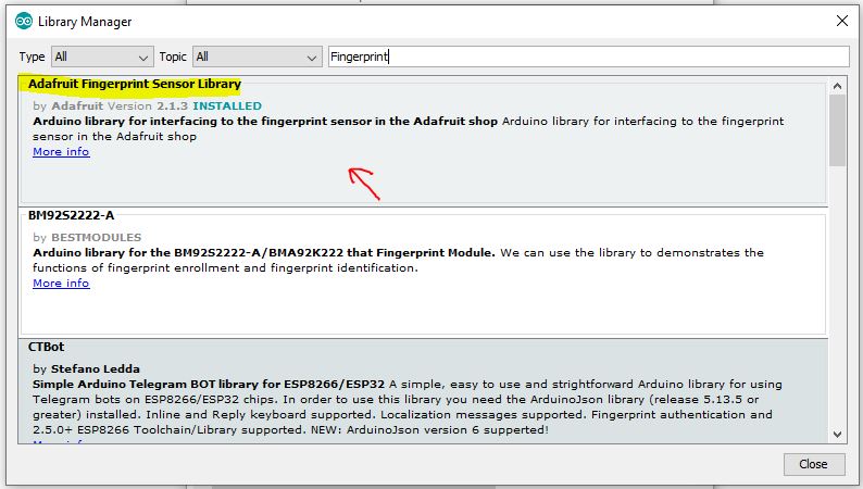 1. install library adafruit. Klik Sketch — Include Library — Manage library. Pada library manager, ketikkan “Fingerprint” dan install adafruit librarynya.