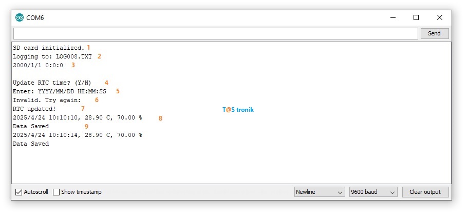 1. Status Pengecekan SD card, jika SD card berhasil terbaca di modul, maka status yang muncul adalah “SD card initialized”. Jika SD card tidak berhasil terbaca karena error atau SD card tidak di masukkan ke modul maka yang muncul adalah pesan “SD card initialization failed!”.