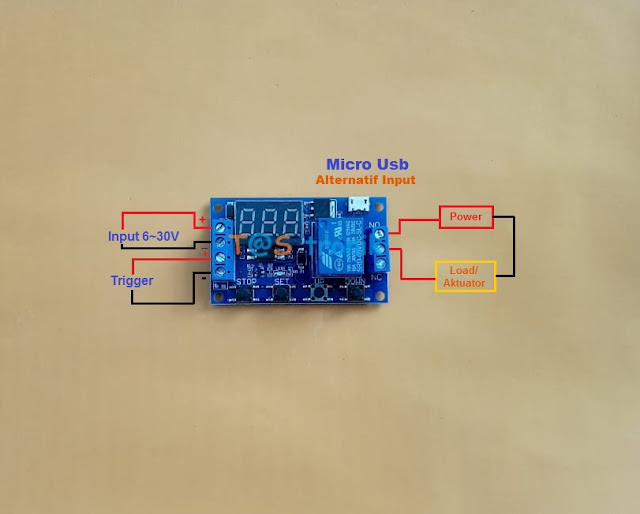 Modul Timer ini memiliki 2 alternatif input power supply, yakni Micro Usb dan Terminal blok (pilih salah satu saja saat menggunakannya).